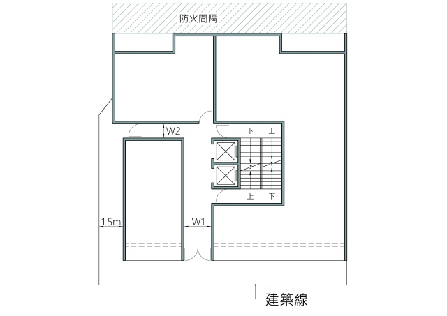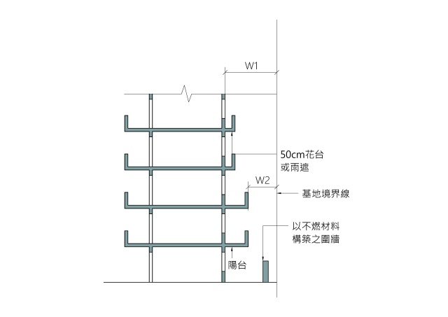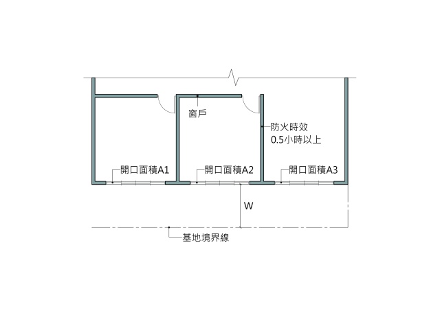 建築物自基地境界線退縮留設之防火間隔在一.五公尺以上未達三公尺範圍內之外牆部分,應具有半小時以上防火時效,其牆上之開口應裝設具同等以上防火時效之防火門窗等防火設備。但同一居室開口面積在三平方公尺以下,且以具半小時防火時效之牆壁(不包括裝設於該牆壁上之門窗)與樓板區劃分隔者,其外牆之開口不在此限。 |