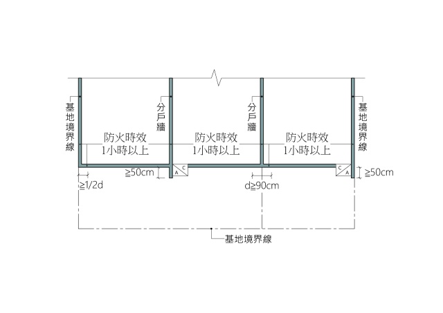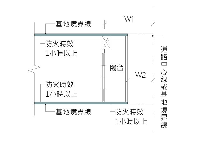 建築物自基地境界線退縮留設之防火間隔未達一.五公尺範圍內之外牆部分,應具有一小時以上防火時效,其牆上之開口應裝設具同等以上防火時效之防火門或固定式防火窗等防火設備。 |