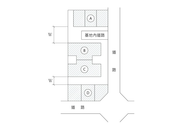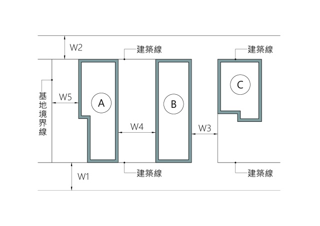 非防火構造建築物,除基地鄰接寬度六公尺以上道路或深度六公尺以上之永久性空地側外,建築物應自基地境界線(後側及兩側)退縮留設淨寬一.五公尺以上之防火間隔。一基地內兩幢建築物間應留設淨寬三公尺以上之防火間隔。 |