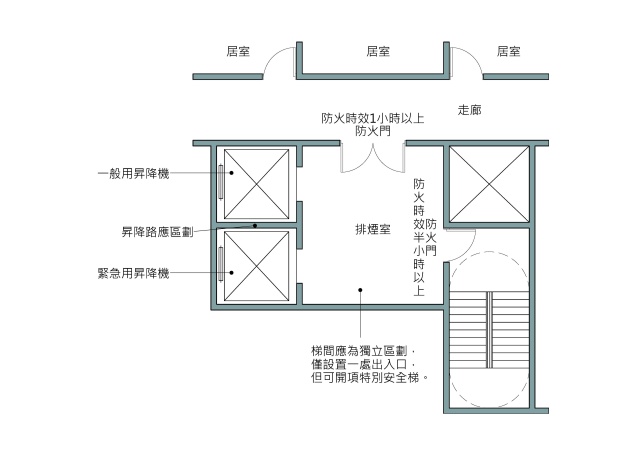 昇降機道應每二部昇降機以具有一小時以上防火時效之牆壁隔開。但連接機間之出入口部分及連接機械間之鋼索、電線等周圍,不在此限。 |